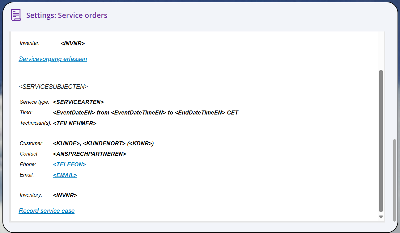 Service order (text): Here you can store a standard text for the service orders. This text will then be taken by Outlook. You can find more about this in the installation and configuration manual.