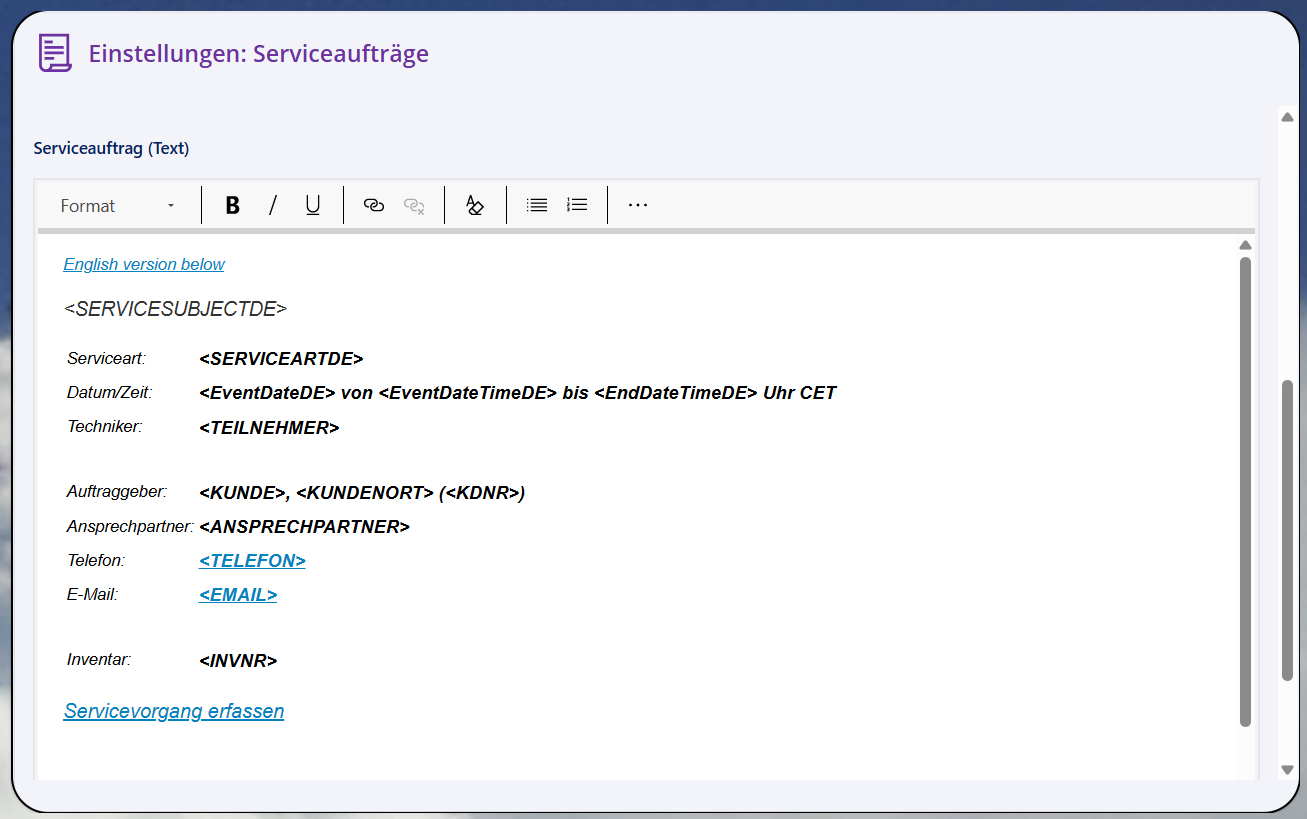 Serviceauftrag (Text): Hier kann ein Standardtext für die Serviceaufträge hinterlegt werden. Dieser Text wird dann von Outlook übernommen. Mehr dazu finden Sie im Installations und Konfigurationshandbuch.