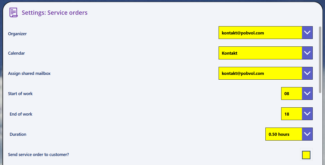 Send service order to customer?: If service orders from Outlook are also to be sent to customers, then this flag must be set.